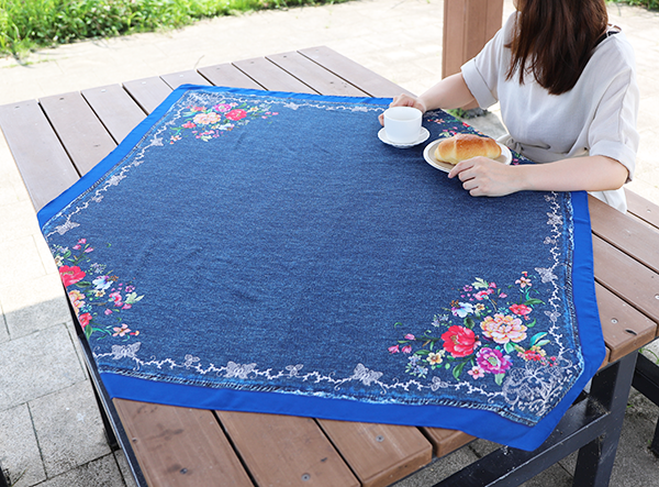 シンプルにデニム柄をプリントして4角の花々が美しく彩っております。