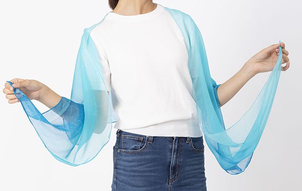薄くてふわっと軽くて柔らかく、幅40cmの多少シャープで使いやすいサイズ感なので、色々な巻き方をお楽しみください。