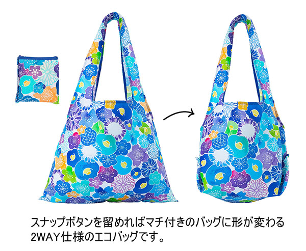 4隅についたスナップボタンを留めればマチ付きのバッグに形が変わる2WAY仕様のエコバッグ。